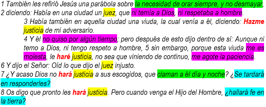 | Una historia para la necesidad de orar 1-2 Quien persevera halla justicia 3-5 Dios es lo contrario al Juez injusto 6-8 |