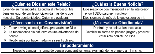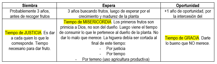Espera: teniendo todos estos elementos, se da el lujo de No dar fruto. Música de fondo (ojo, no que signifique literalmente esto): Jesús ha dicho en otros pasajes, Israel es una higuera (Ezequiel, Oseas, Isaías, Joel mencionan a Israel como higuera). En el NT Jesús maldijo una higuera que no tenía fruto. El tiempo normal para que una higuera de fruto es 3 años. A los 3 años el va a buscar, pero no va una sola vez ése año, sino que varias veces va.